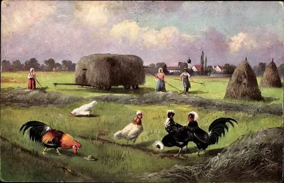 Künstler Ak Bauern beim Heumachen, Hühner, Schnecke