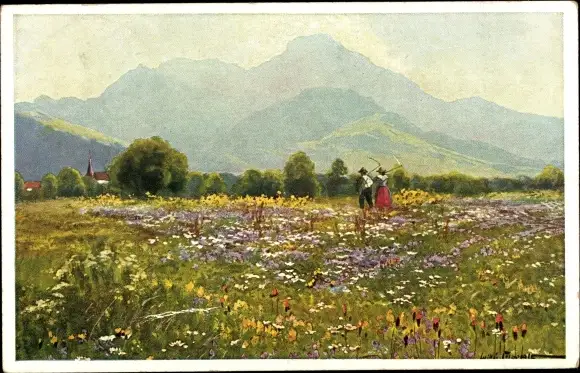 Künstler Ak Bauern mit Sensen auf einer Blumenwiese, Gebirge