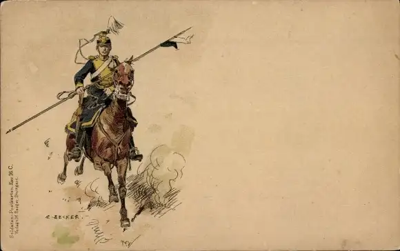 Künstler Ak Becker, C., Soldat in voller Ausrüstung, Kavallerie, Kaiserzeit
