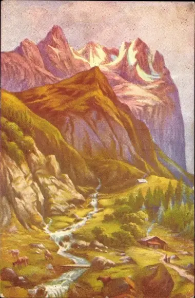 Künstler Ak Bergpartie, Bach, Kühe, Alm, Adolph Webers Thee, Doppelkopf