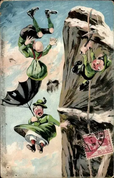 Künstler Ak, Bergsteiger fallen vom Berg, Schirm