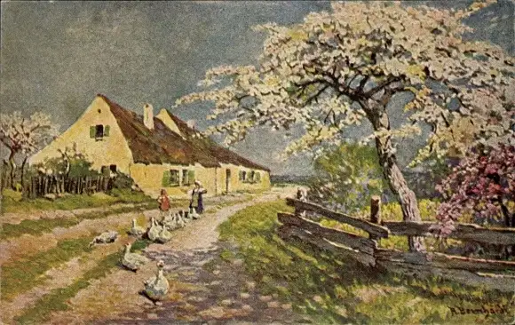 Künstler Ak Bernhardt, A, Dorfpartie, Gänse