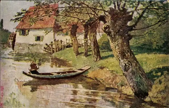 Künstler Ak Bernhardt, A, Wassermühle, Angler