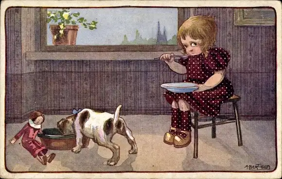 Künstler Ak Bertiglia, A., Mädchen beim Essen, Hund mit Futternapf, Puppe