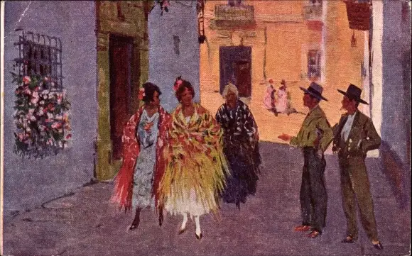 Künstler Ak Bertuchi, Frauen und Männer in spanischen Trachten