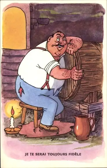 Künstler Ak Betrunkener Mann umarmt ein Weinfass