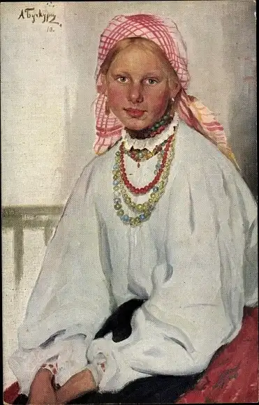 Künstler Ak Boutschkouri, A., Erblüht, Frau in Volkstracht, Russland