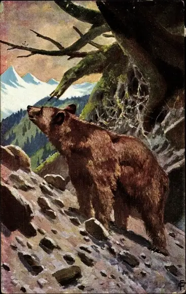 Künstler Ak Braunbär in einem Gebirge, Berggipfel