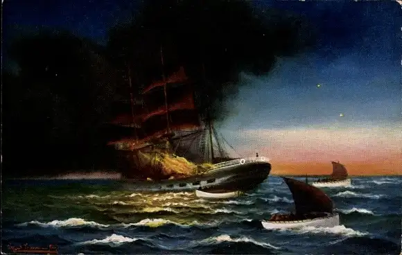 Künstler Ak Brennendes Segelschiff auf Hochsee, Rettungsboote