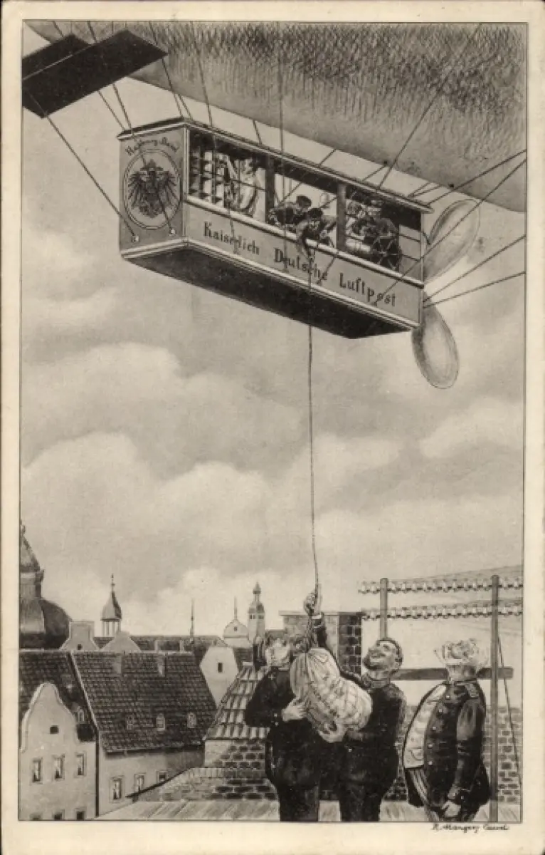 Künstler Ak Briefpostbeförderung, Kaiserl. Deutsche Luftpost, Zeppelin Luftschiff nimmt Postsack auf