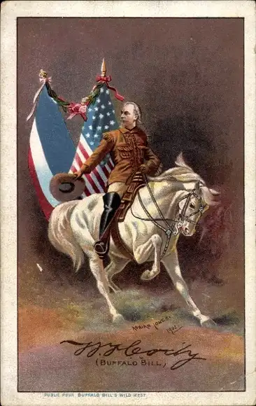 Künstler Ak Buffalo Bill zu Pferd, Fahnen Frankreich und USA