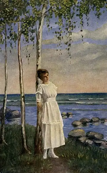 Künstler Ak Burger, F., Erwartung, Frau am Baum, Seeufer