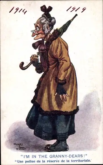 Künstler Ak Buxton, Dudley, Alte Frau mit Regenschirm