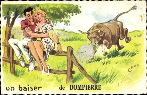Künstler Ak Chaperon, J., Liebespaar, Zaun, Wütender Stier