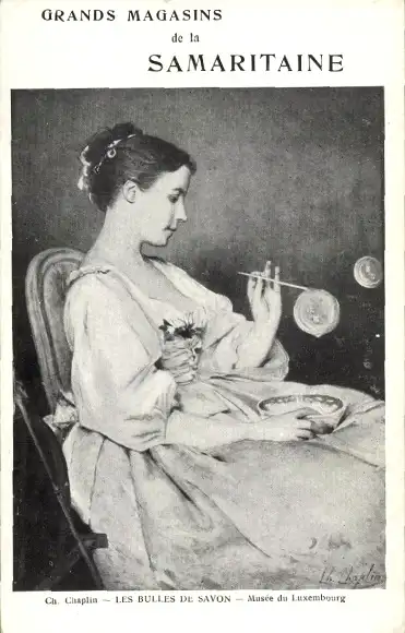 Künstler Ak Chaplin, C., Les Bulles de Savon, Reklame, Grands Magasins de la Samaritaine