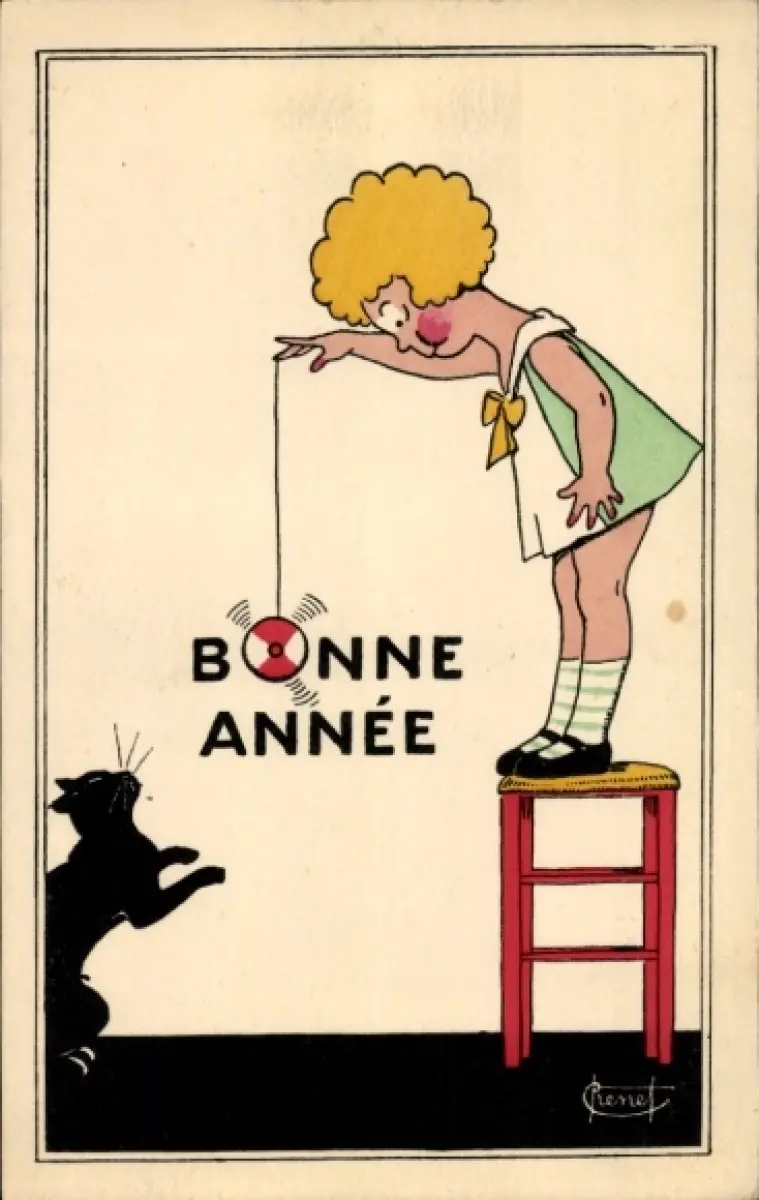 Künstler Ak Chenet, Glückwunsch Neujahr, Mädchen mit einem Jojo, Katze