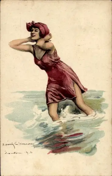 Künstler Ak Clemenny, Frau in Badekleidung, Bademode