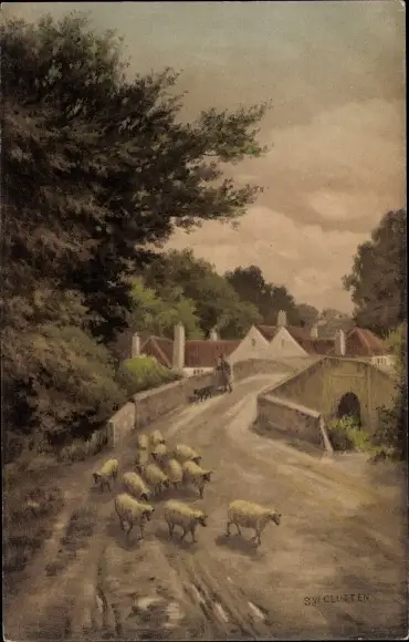 Künstler Ak Clutten, Schafherde auf einer Straße, Hirt