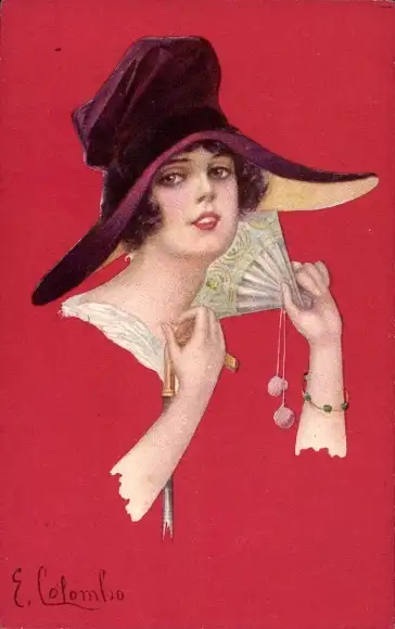 Künstler Ak Colombo, E., Frau mit Fächer, Hut, Porträt