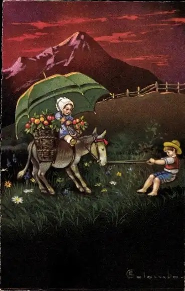 Künstler Ak Colombo, Junge zieht störrischen Esel