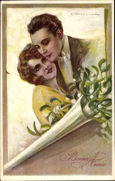 Künstler Ak Corbella, T., Glückwunsch Neujahr, Misteln, Liebespaar