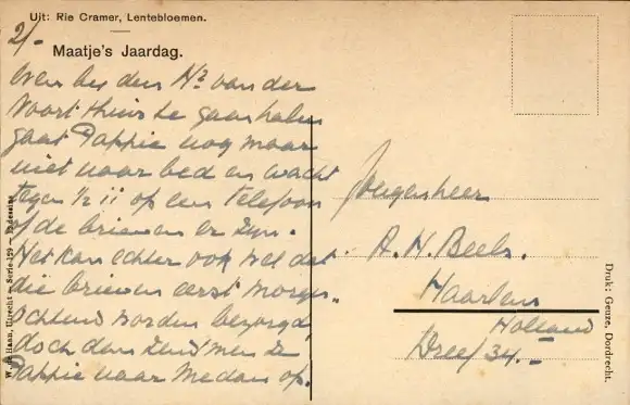 Künstler Ak Cramer, Rie, Frühlingsblumen, Maatjes Jahrtag