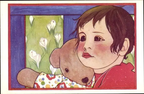 Künstler Ak Cramer, Rie, Jan in de Box, Kind mit Teddybär