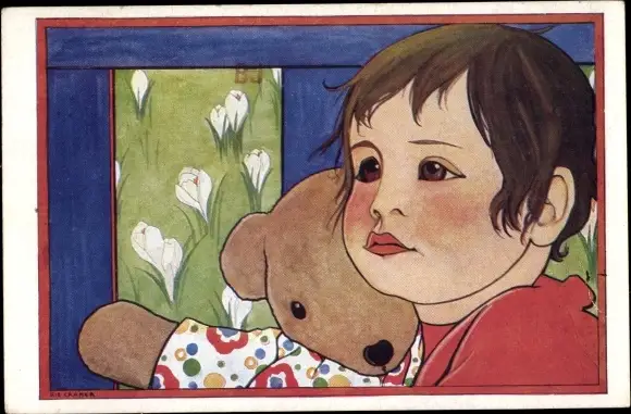 Künstler Ak Cramer, Rie, Jan in de Box, Kind mit Teddybär