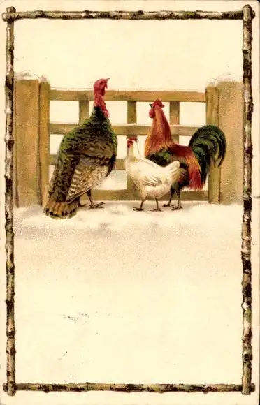 Künstler Ak Curiosité, Hahn und Henne stehen mit Truthahn am Zaun