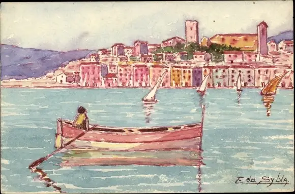 Künstler Ak Da Silva, T., Ruderpartie, Segelboote, Stadtbild