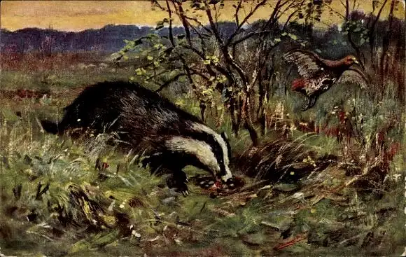 Künstler Ak Dachs auf der Wiese, Vogel im Flug