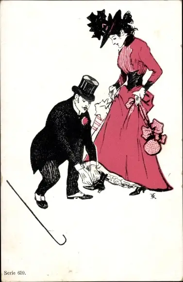 Künstler Ak Dame im roten Kleid, Mann bindet ihr die Schuhe, Schirm