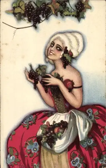Künstler Ak Dame im roten Kleid pflückt Weintrauben