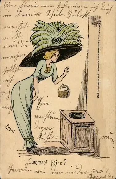 Künstler Ak Dame mit großem Hut vor einer Toilette