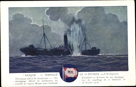 Künstler Ak Dampfschiff Basque, Messageries Maritimes, unter Beschuss 1918
