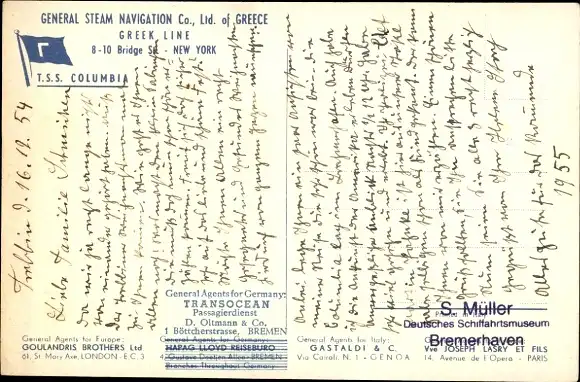 Künstler Ak Dampfschiff TSS Columbia, Greek Line