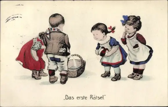 Künstler Ak Das erste Rätsel, Junge pinkelt in einen Korb, Mädchen schauen zu
