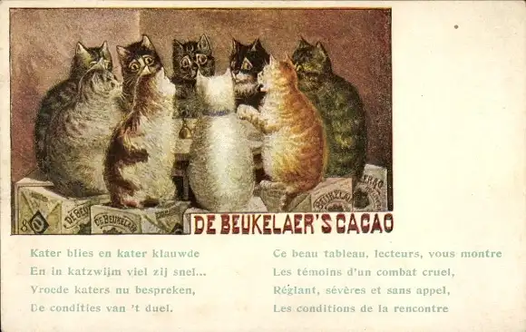 Künstler Ak Debeukelaer Cacao, vermenschlichte Katzen an einem Tisch, Reklame