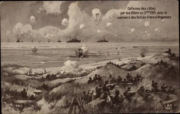 Künstler Ak Defenses des cotes par les Allies avec le concours des flottes Franco Anglaises, I WK