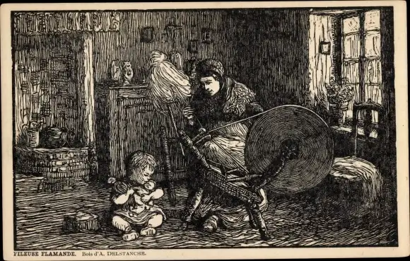 Künstler Ak Delstanche, Flämischer Spinner, Spinnrad, Frau in Tracht