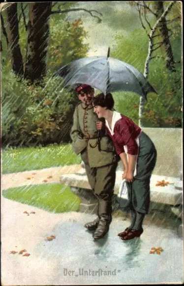 Künstler Ak Der Unterstand, Soldat hält Frau den Regenschirm, Immer Fachmann, I. WK