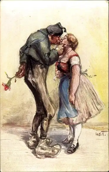 Künstler Ak Der erste Kuss, Liebespaar, Junger Mann mit einer Blume
