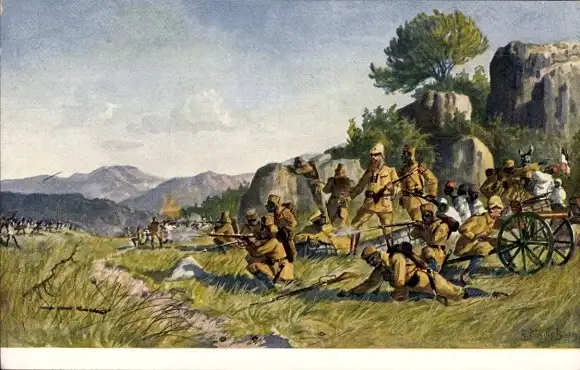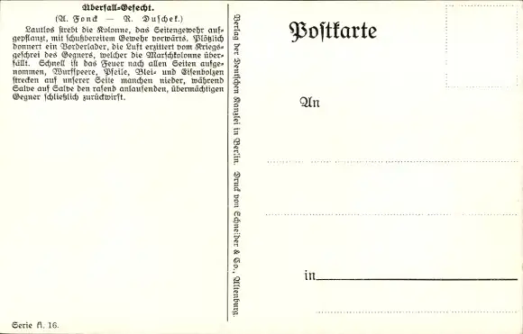 Künstler Ak Deutsche Kolonie, Überfall-Gefecht, Soldaten in Uniformen