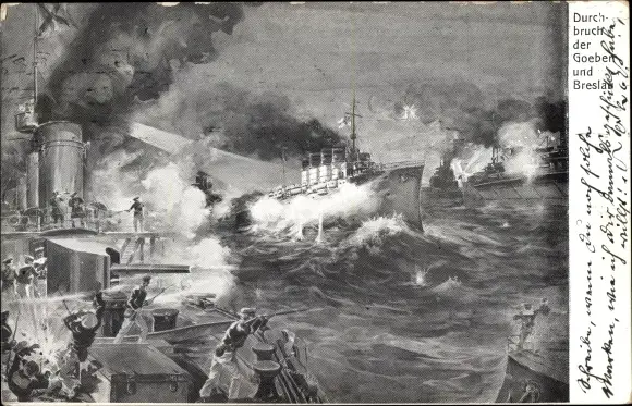 Künstler Ak Deutsche Kriegsschiffe, SMS Goeben, SMS Breslau, Seeschlacht, Durchbruch