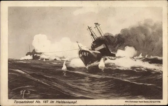 Künstler Ak Deutsche Kriegsschiffe, Torpedoboot 187 im Heldenkampf, Kaiserliche Marine