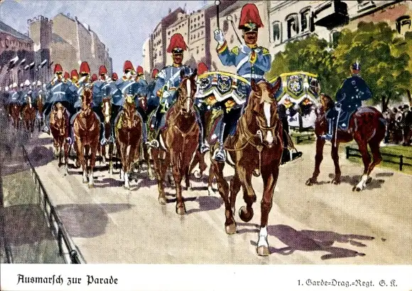 Künstler Ak Döbrich Steglitz, 1. Garde Dragoner Regiment, Ausmarsch zur Parade