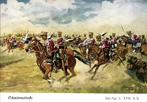 Künstler Ak Döbrich Steglitz, Husaren Regiment 5, Schwärmattacke