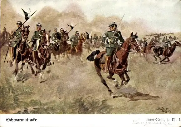 Künstler Ak Döbrich Steglitz, Jäger zu Pferde 3, Schwarmattacke