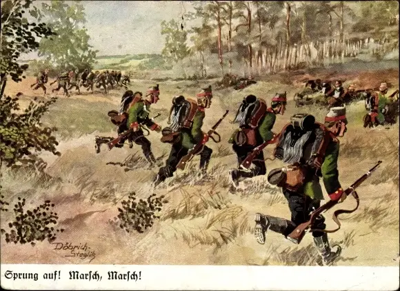 Künstler Ak Döbrich-Steglitz, Sprung auf, Marsch Marsch, Soldaten im Gefecht