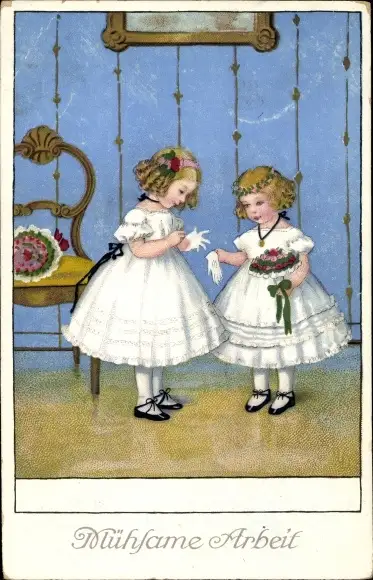 Künstler Ak Döring, Lia, Mühsame Arbeit, zwei Mädchen in weißen Kleidern